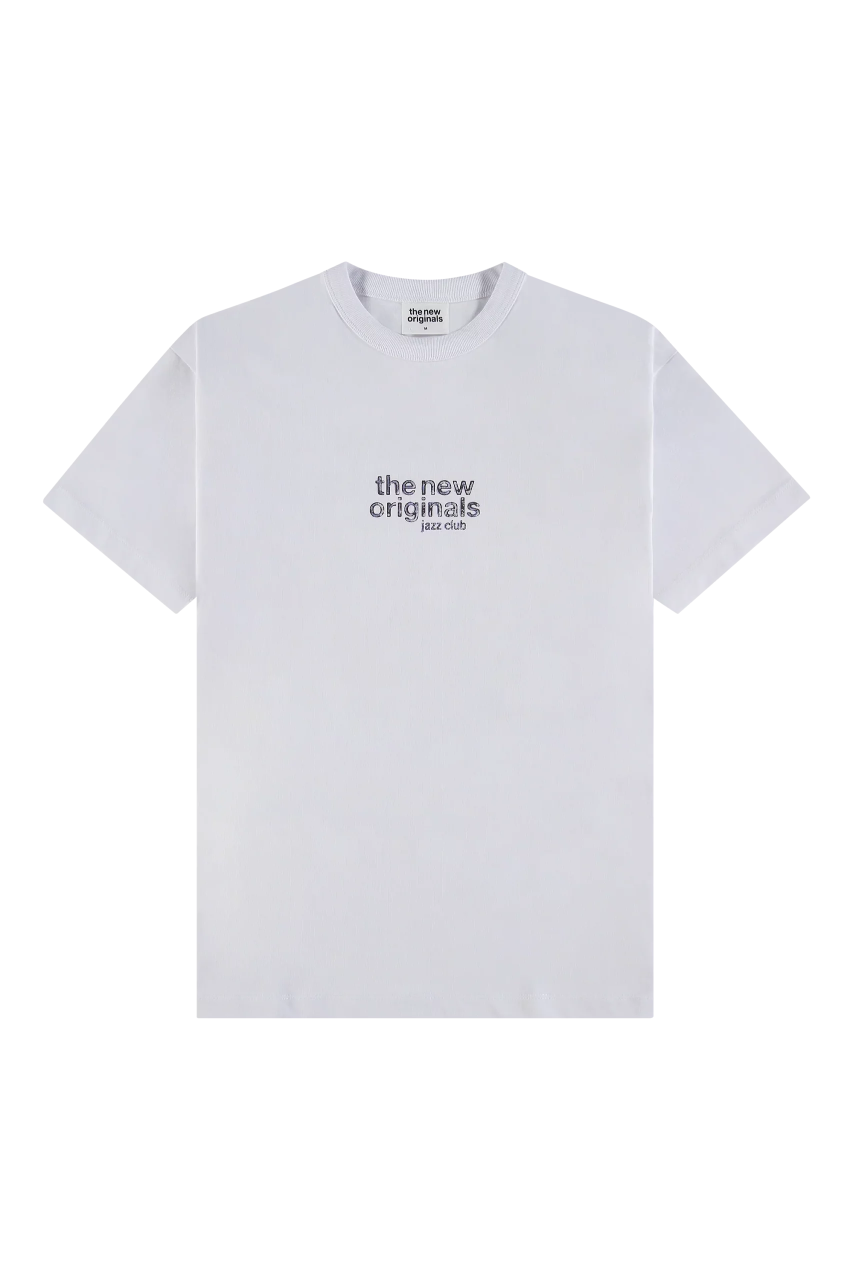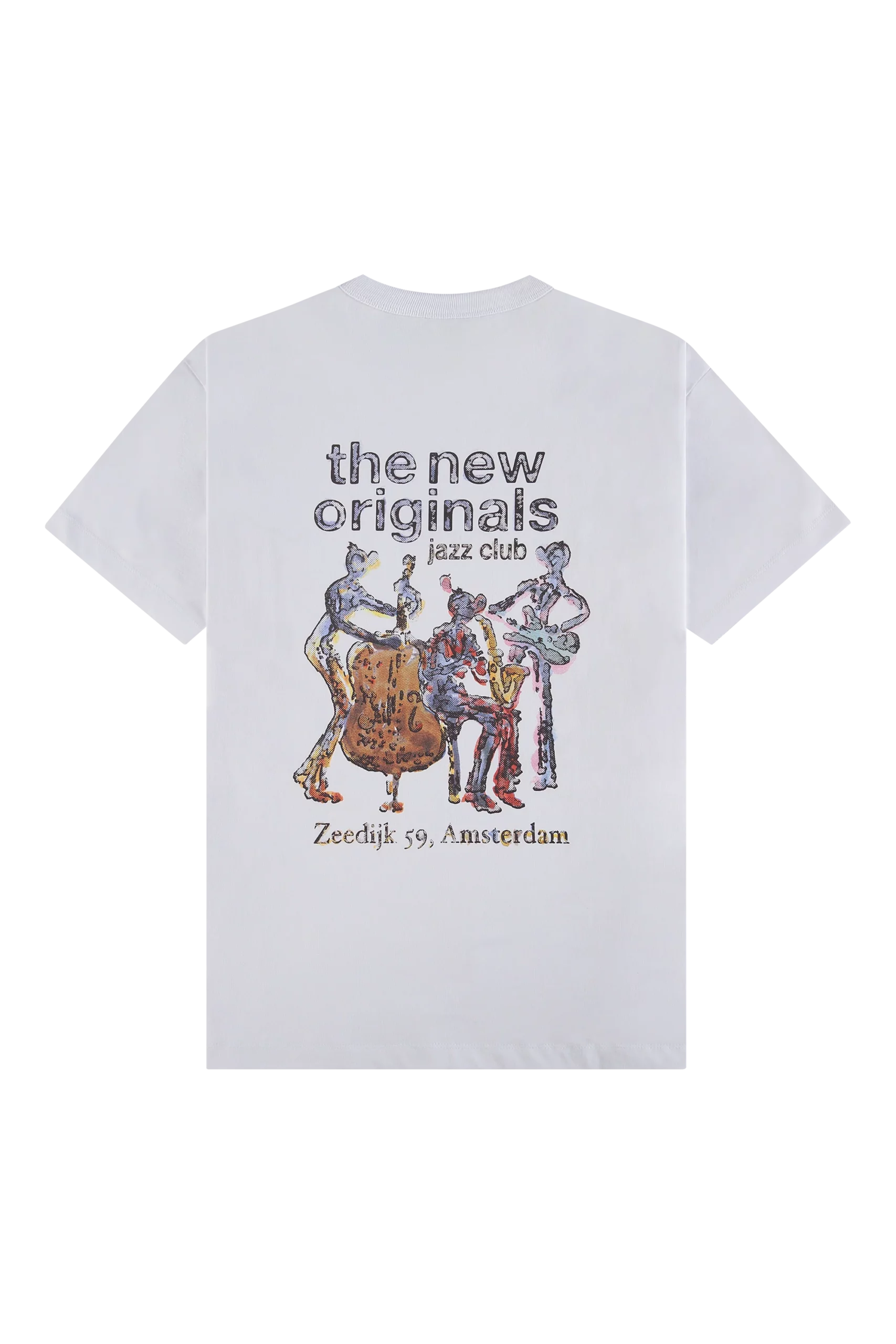 Le t-shirt Jazz Club en blanc. Le motif au dos s’inspire des affiches de jazz classiques, mettant en valeur un trio de musiciens en plein concert, tandis que le devant affiche une sérigraphie épurée du nouveau logo original du club de jazz