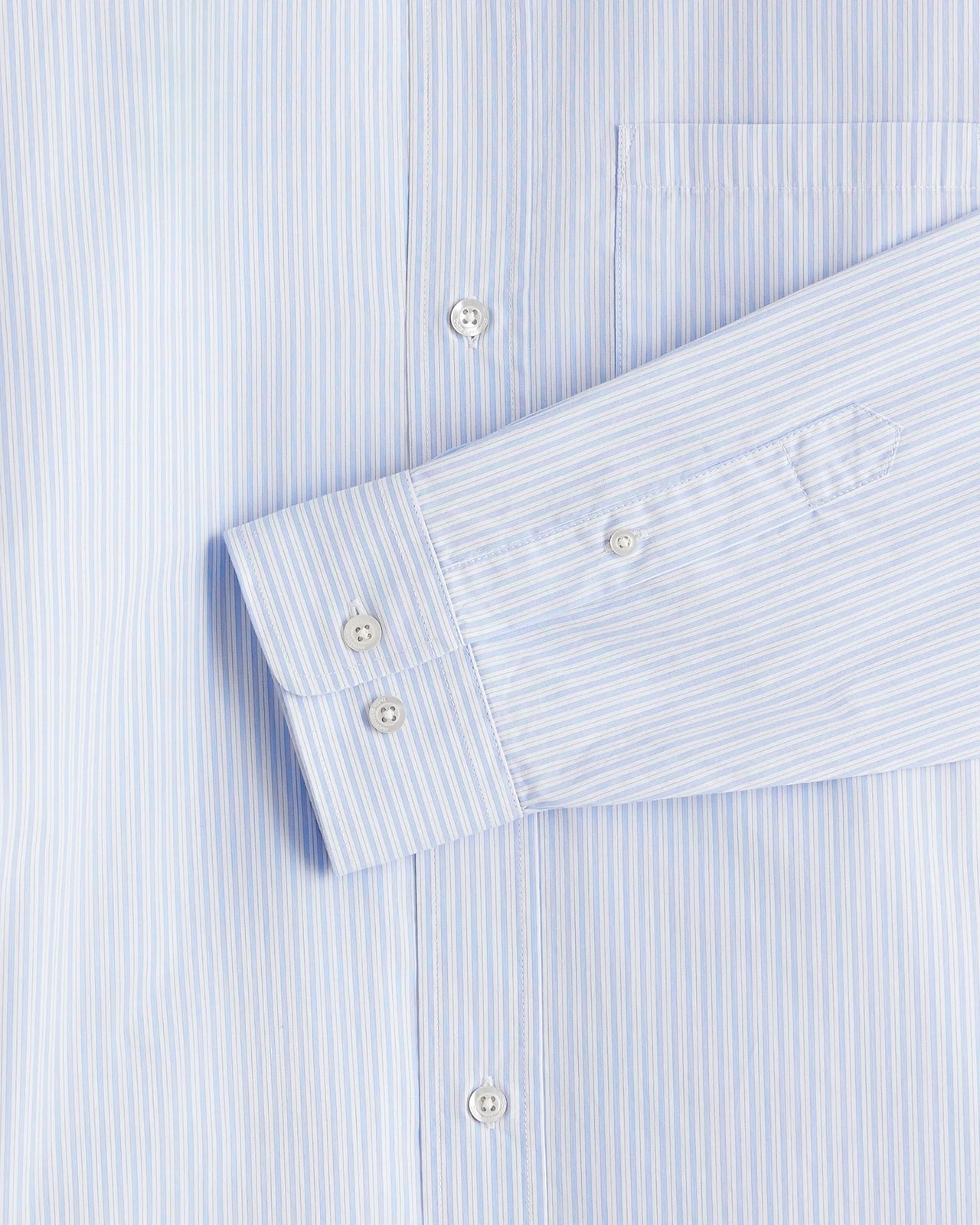 Cette chemise rayée 100 % coton bleu clair a des manches longues avec des boutons de poignet, une poche plaquée sur la poitrine avec une broderie « Drôle » et six boutons gravés sur le devant.