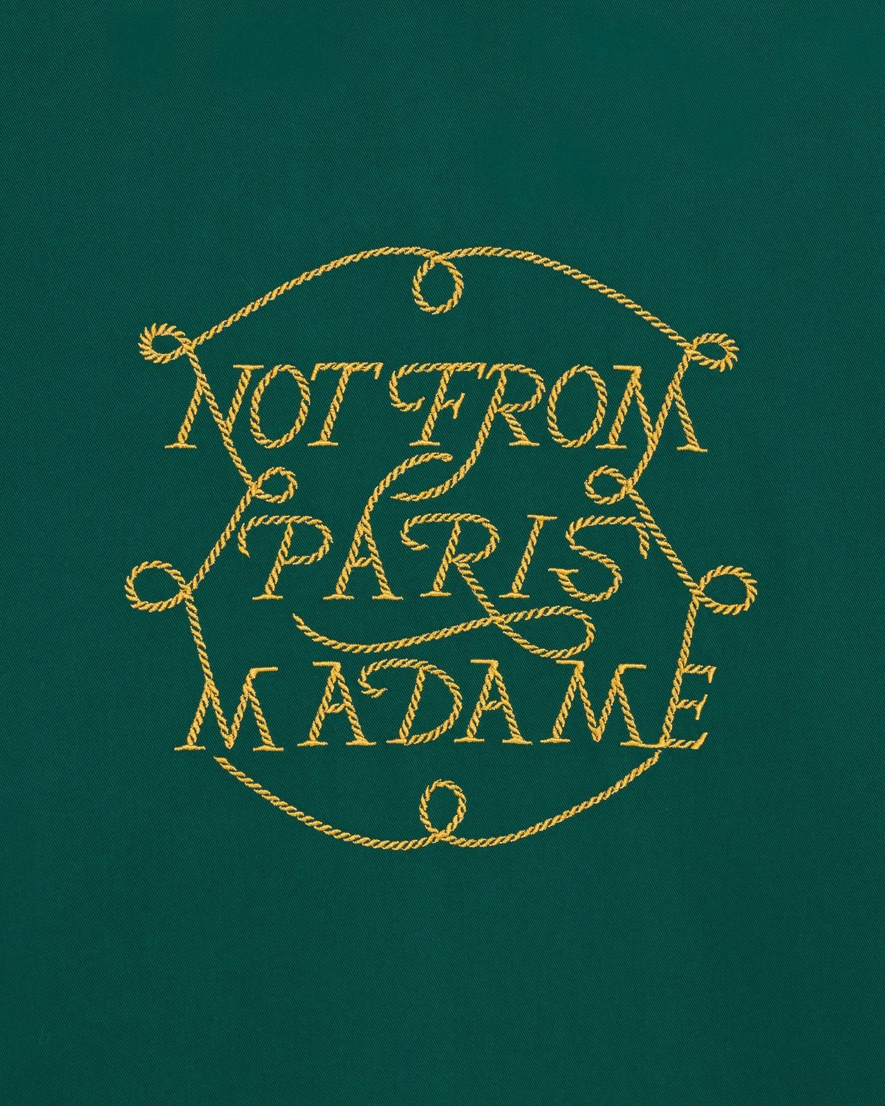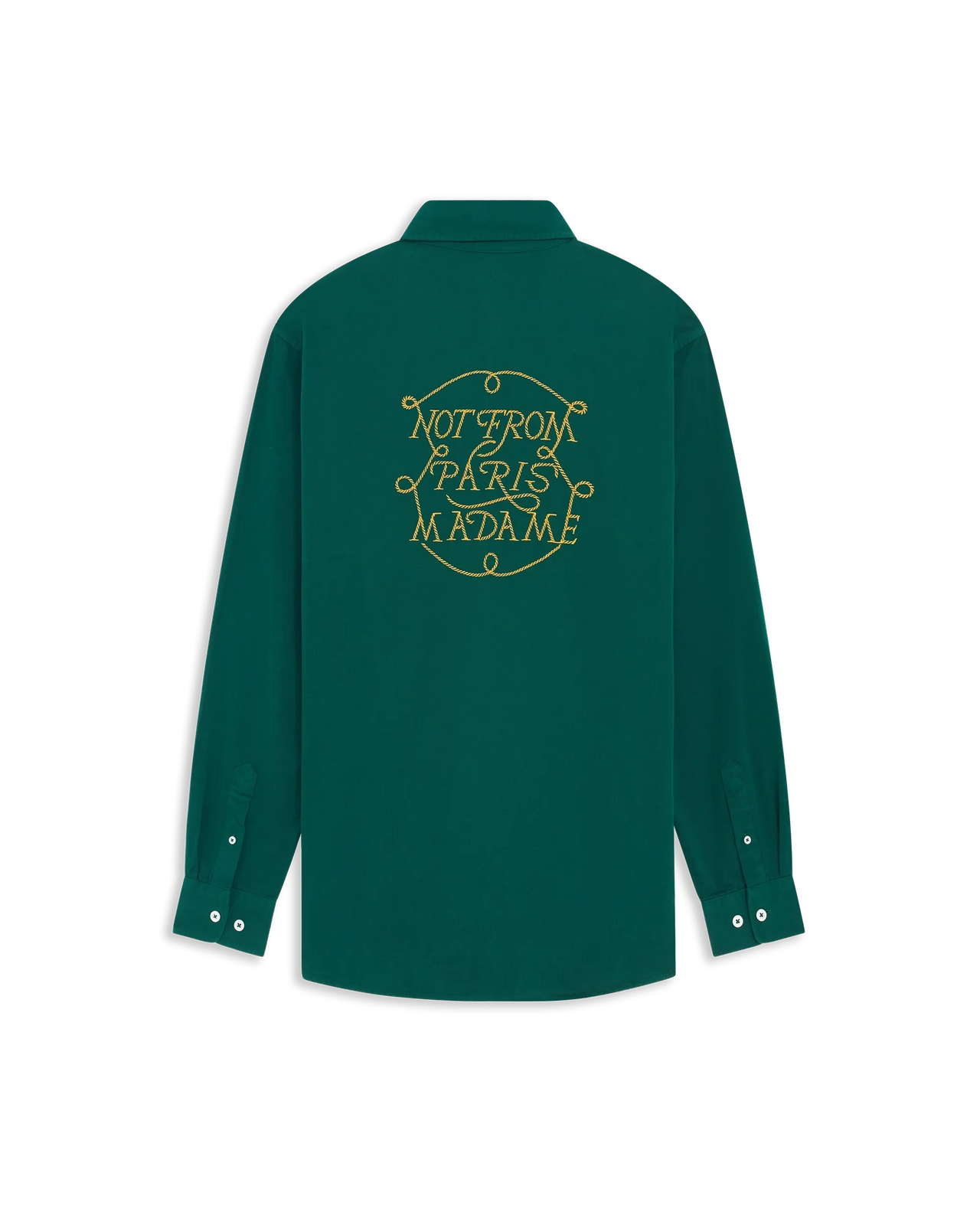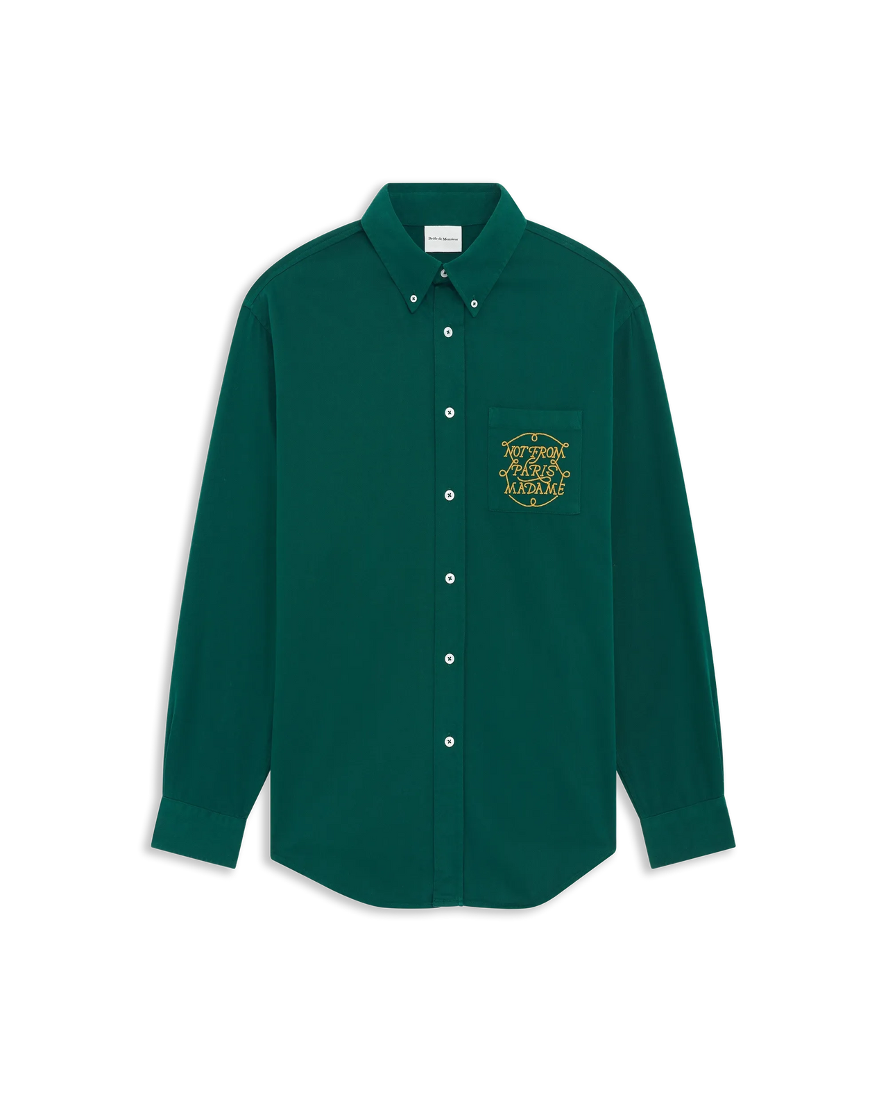 Cette chemise à manches longues 100 % coton vert foncé est brodée du motif Slogan Tresses à l’avant et à l’arrière. Il est doté d’une poche plaquée poitrine, de poignets boutonnés, de sept boutons avant gravés et d’un ourlet de chemise.