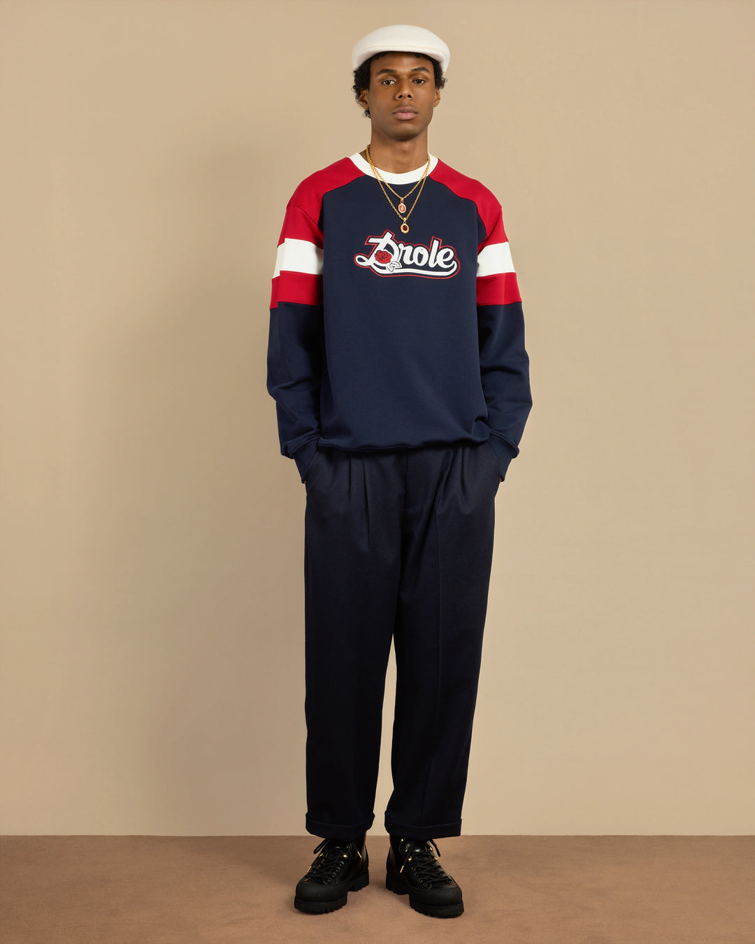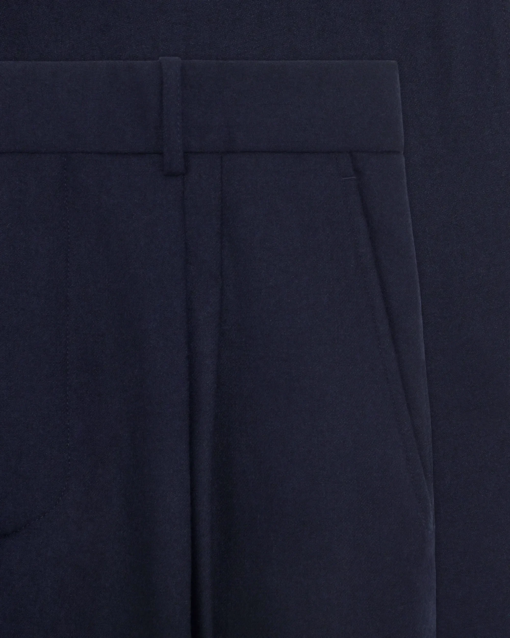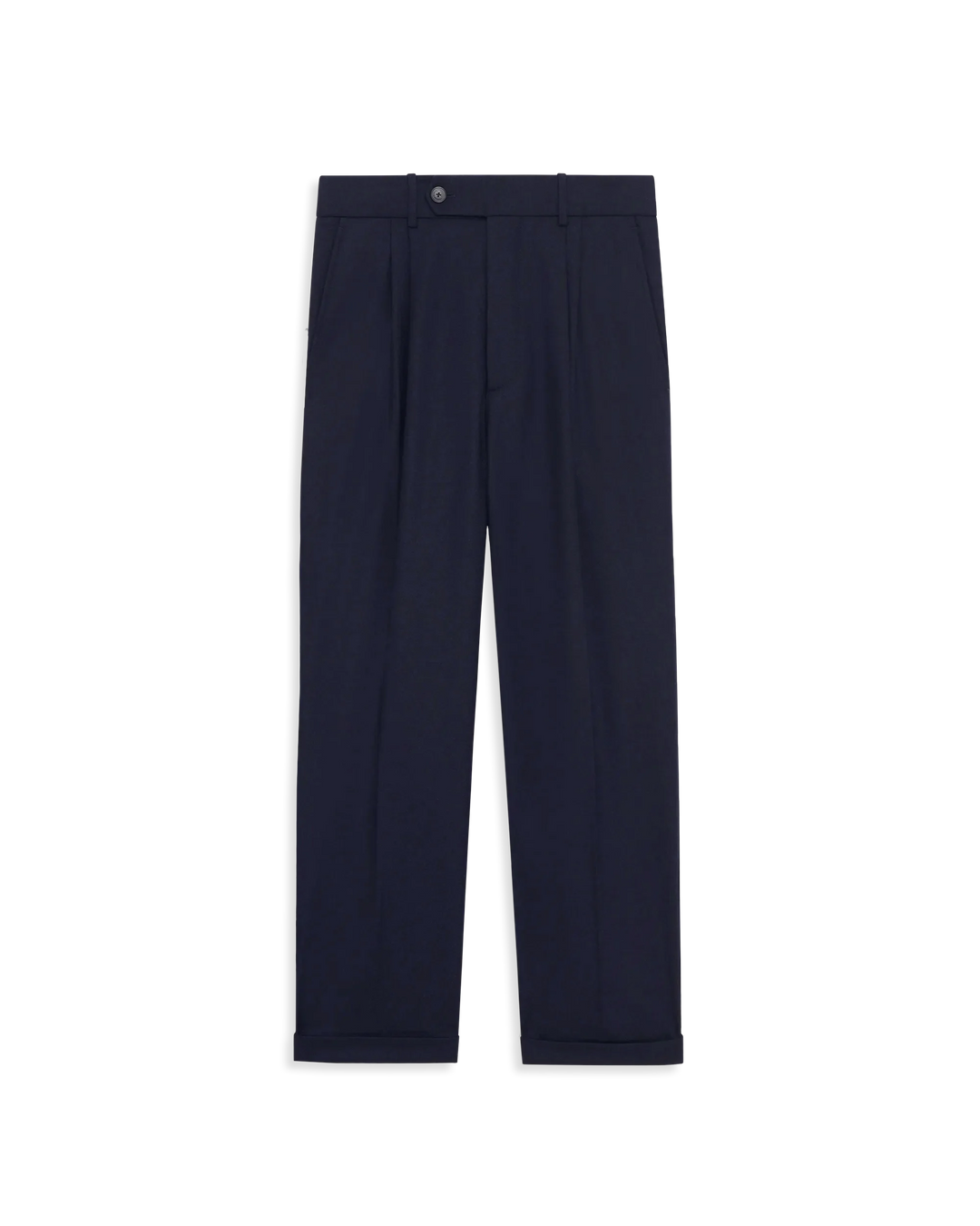 Ce pantalon en mélange de laine à 2 plissés bleu marine est court et mancheté. Ils ont deux poches italiennes, deux poches passepoilées boutonnées à l’arrière, des boucles de ceinture personnalisées, une fermeture à glissière et à bouton et un patch Drôle Tresse à l’arrière.