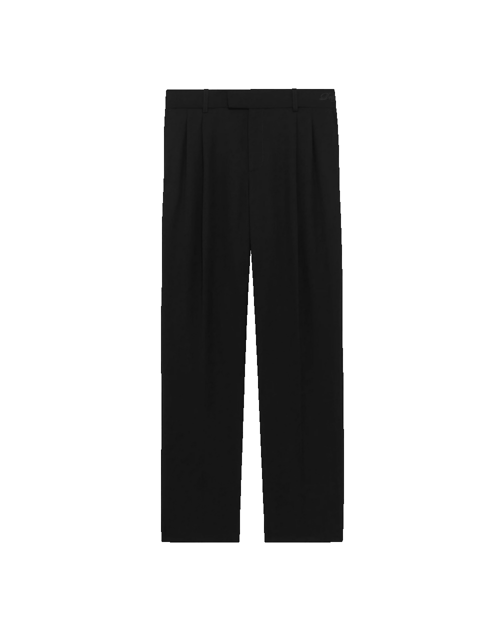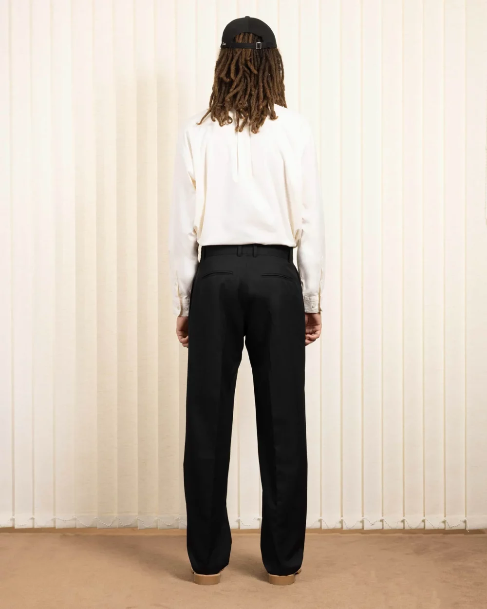 Ce pantalon noir à deux plis en laine mélangée dispose de deux poches latérales, de deux poches passepoilées au dos, d’un passant de ceinture personnalisé et d’une fermeture zip et clip