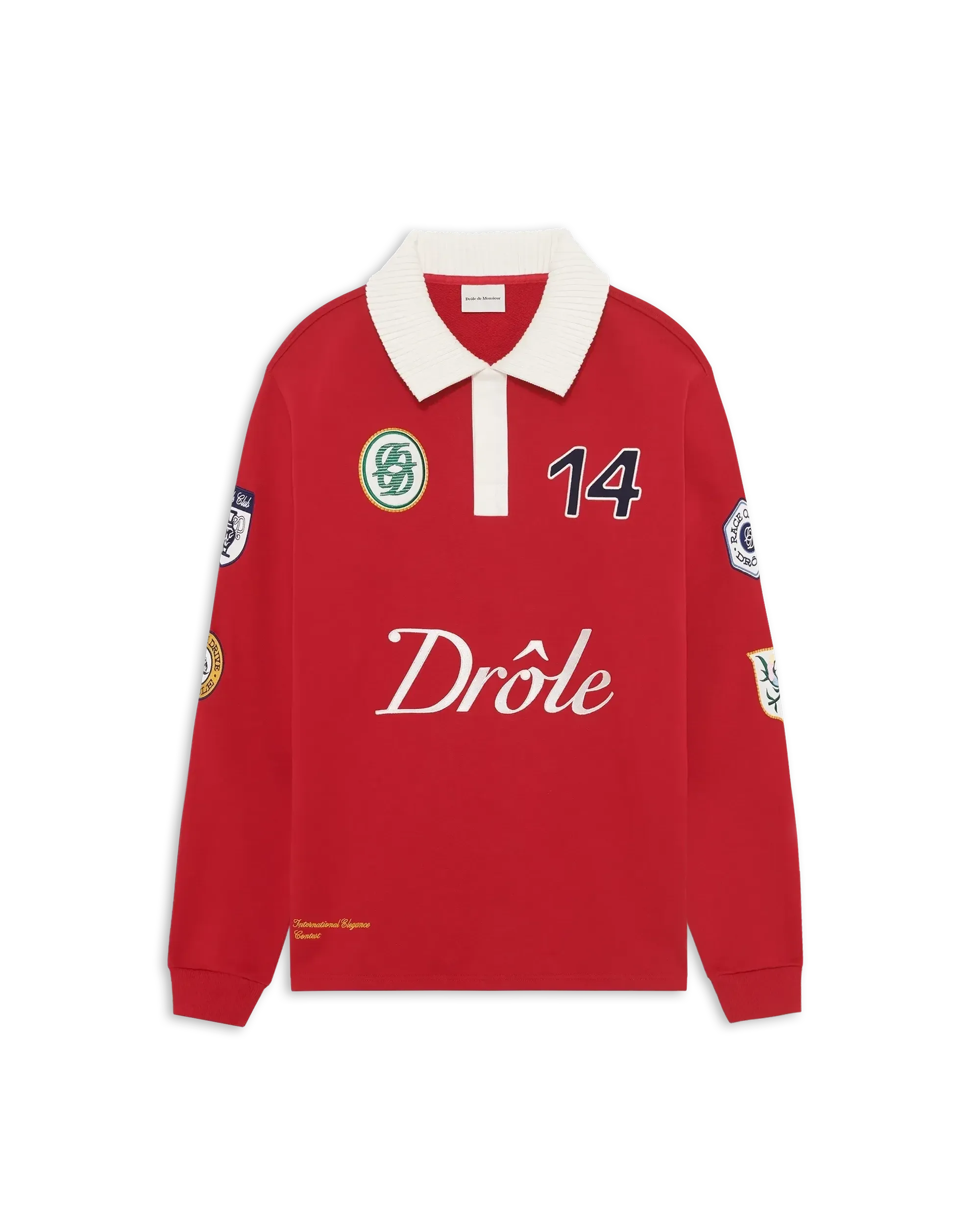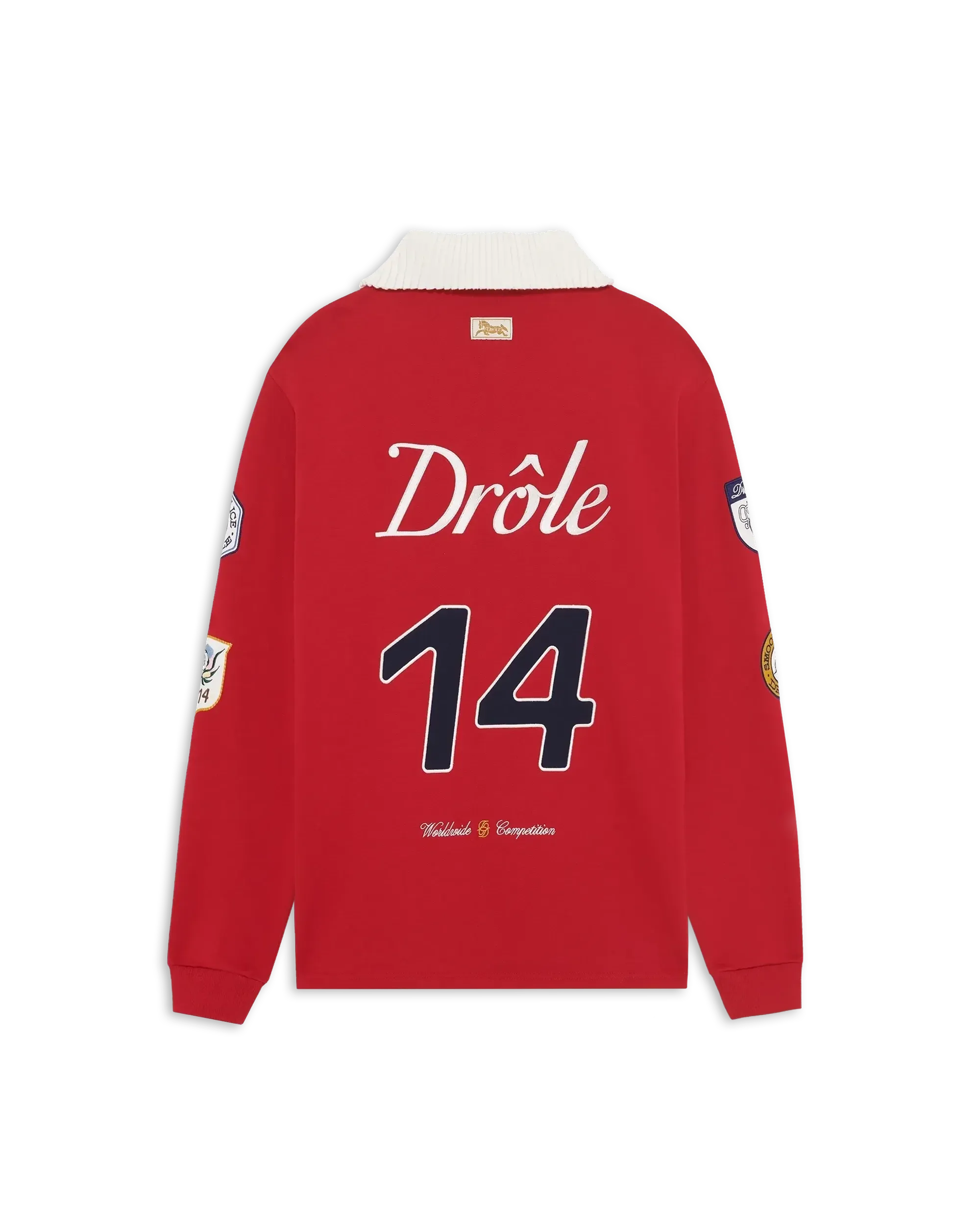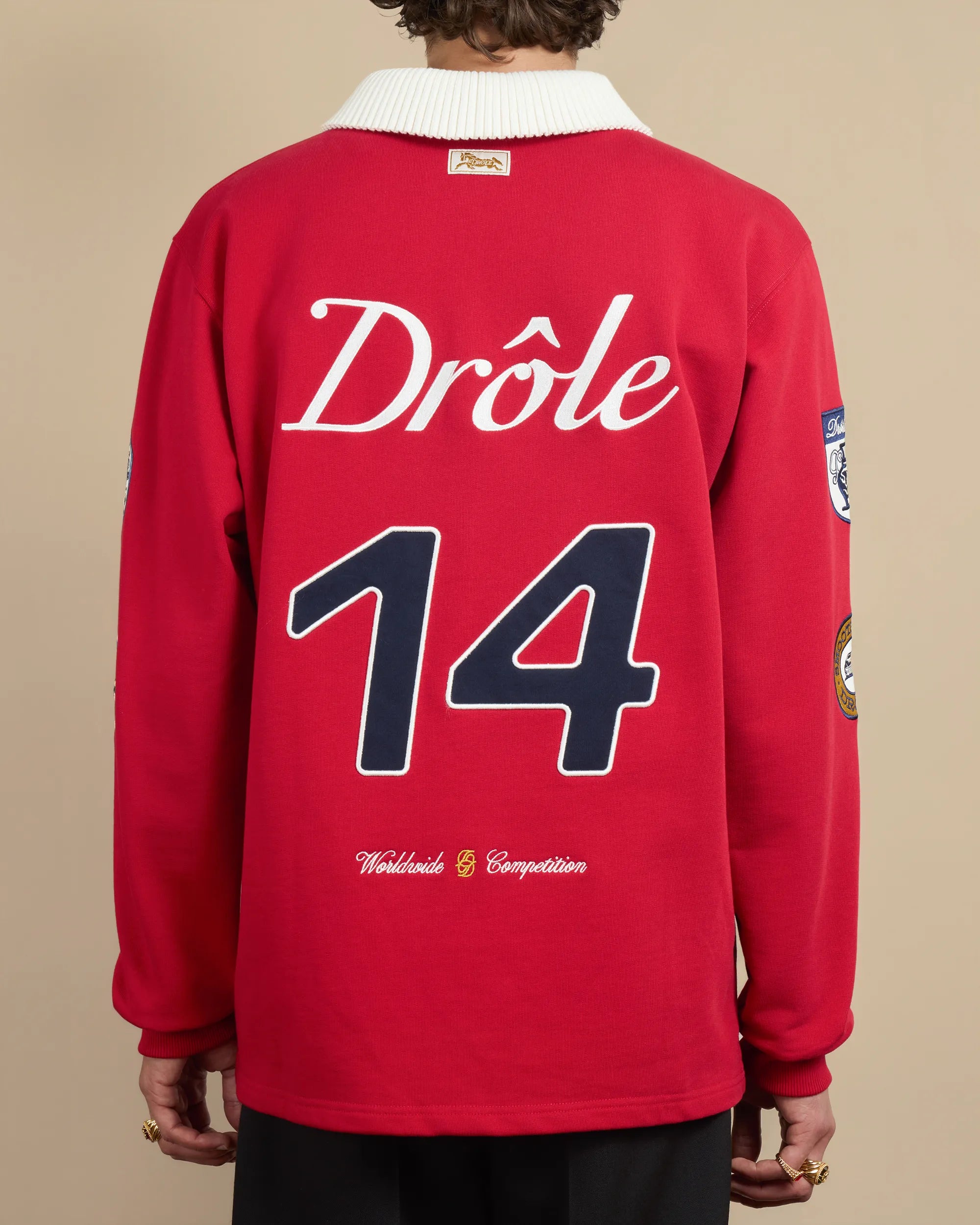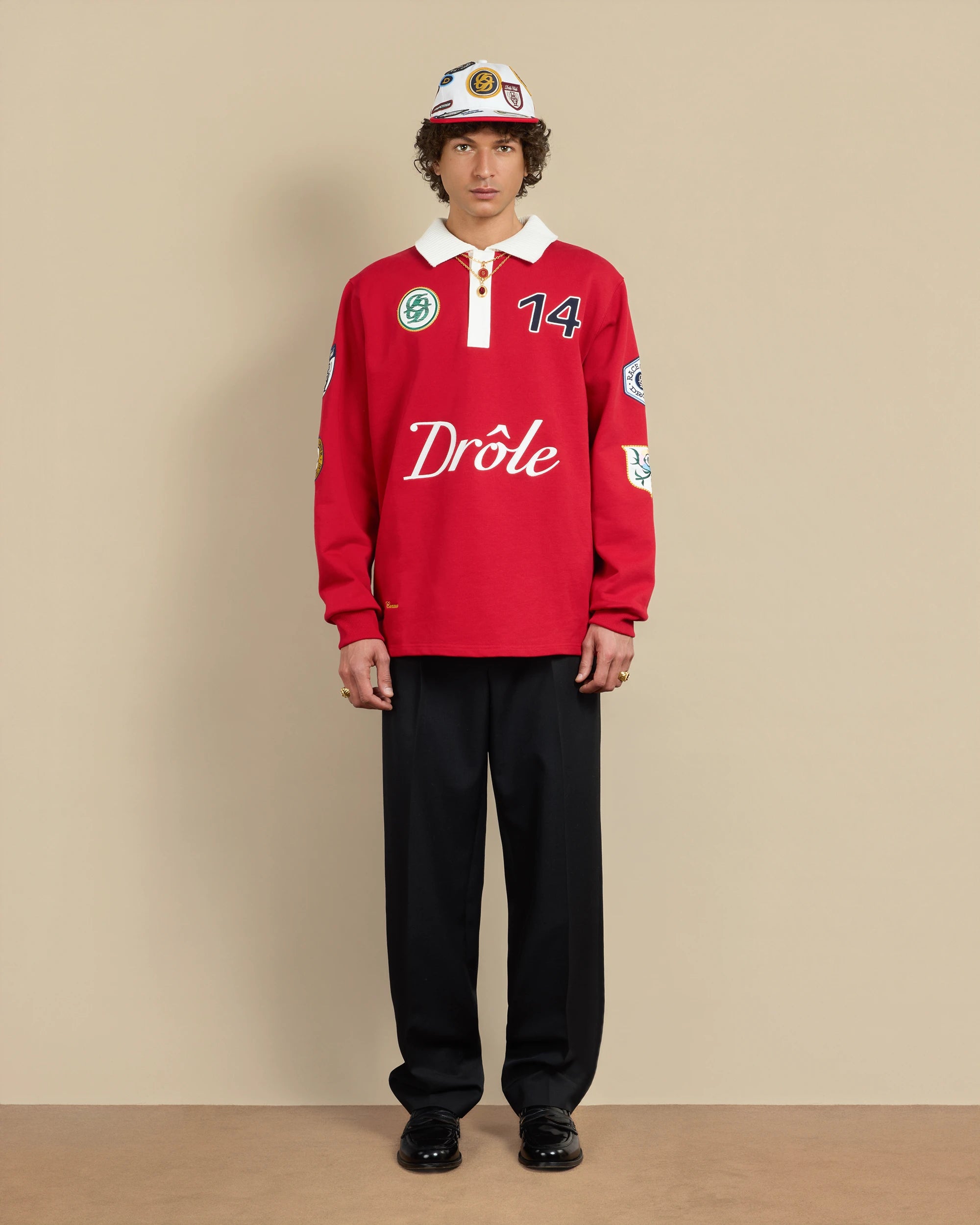 Ce polo rouge manches longues 100% coton est orné de patchs et d’une broderie « Drôle » à l’avant et au dos. Le col et la patte de boutonnage sont en bord-côte contrasté et les bas de manches sont en bord-côte.