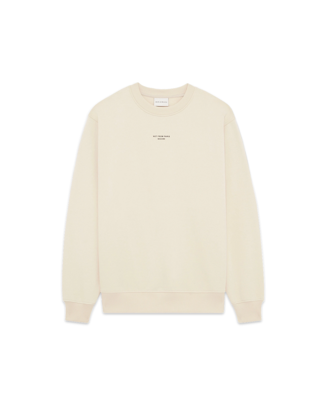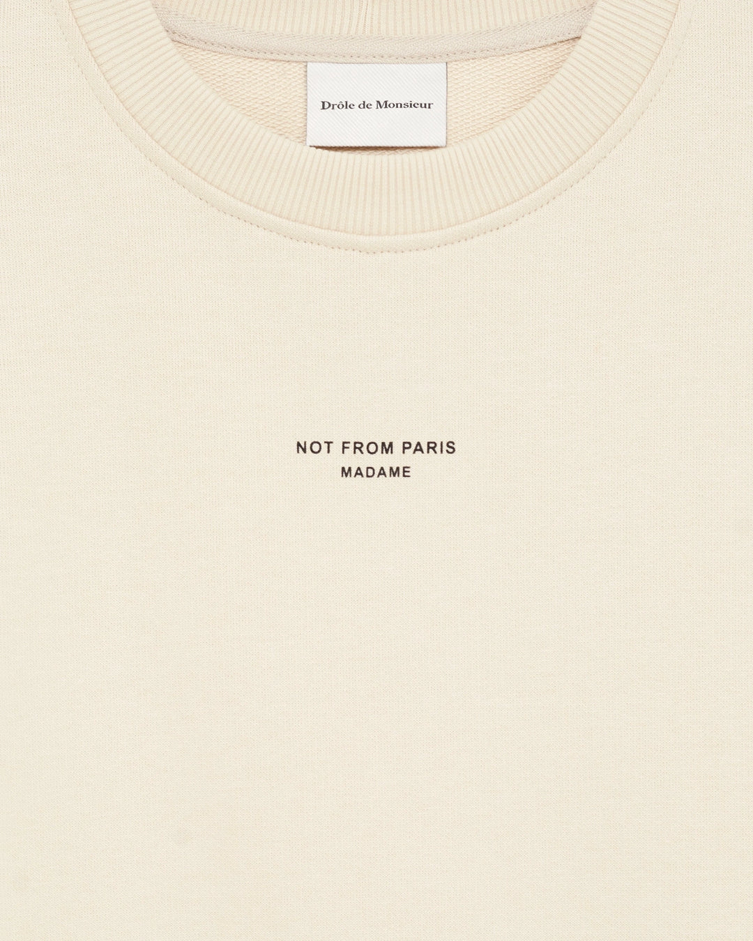 Ce sweat-shirt éponge française 100 % coton beige avec ourlet côtelé et poignets est imprimé avec le slogan « Pas de Paris Madame » sur le devant.