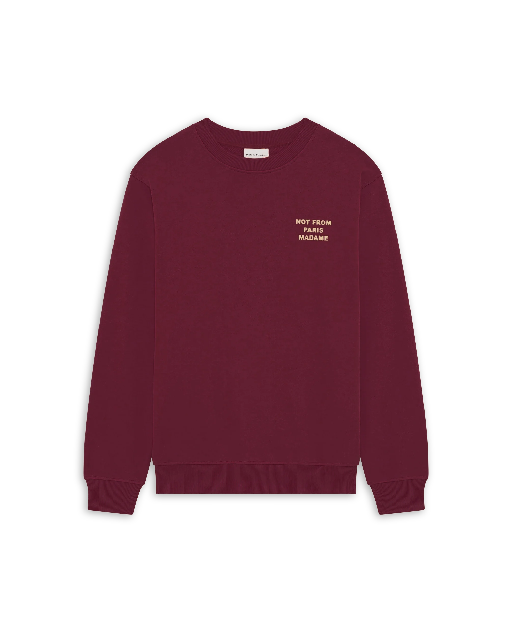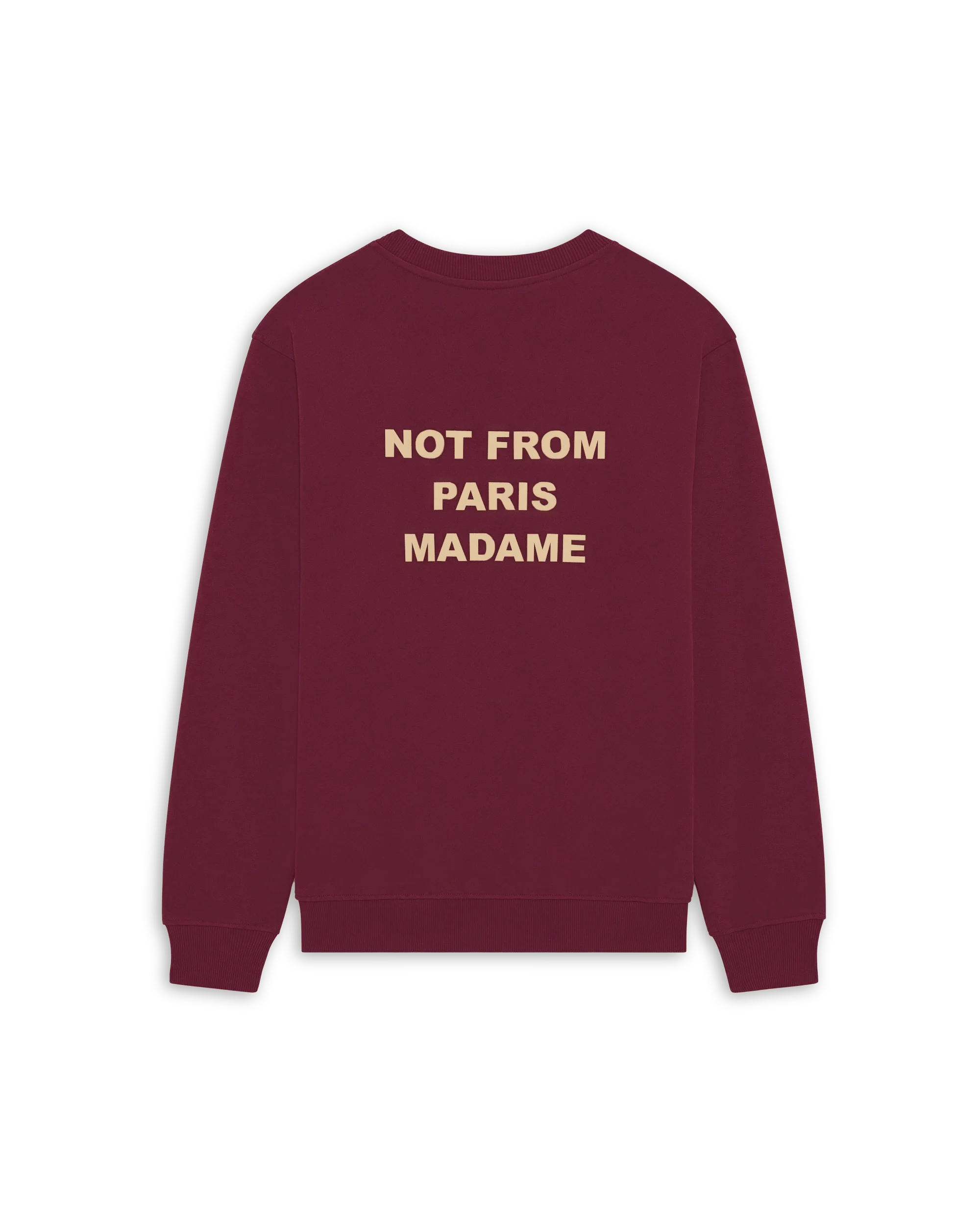 Ce sweat kaki en tissu éponge 100% coton, à poignets et bas de corps côtelés, est imprimé du slogan « Not from Paris Madame » à l’avant et brodé au dos.