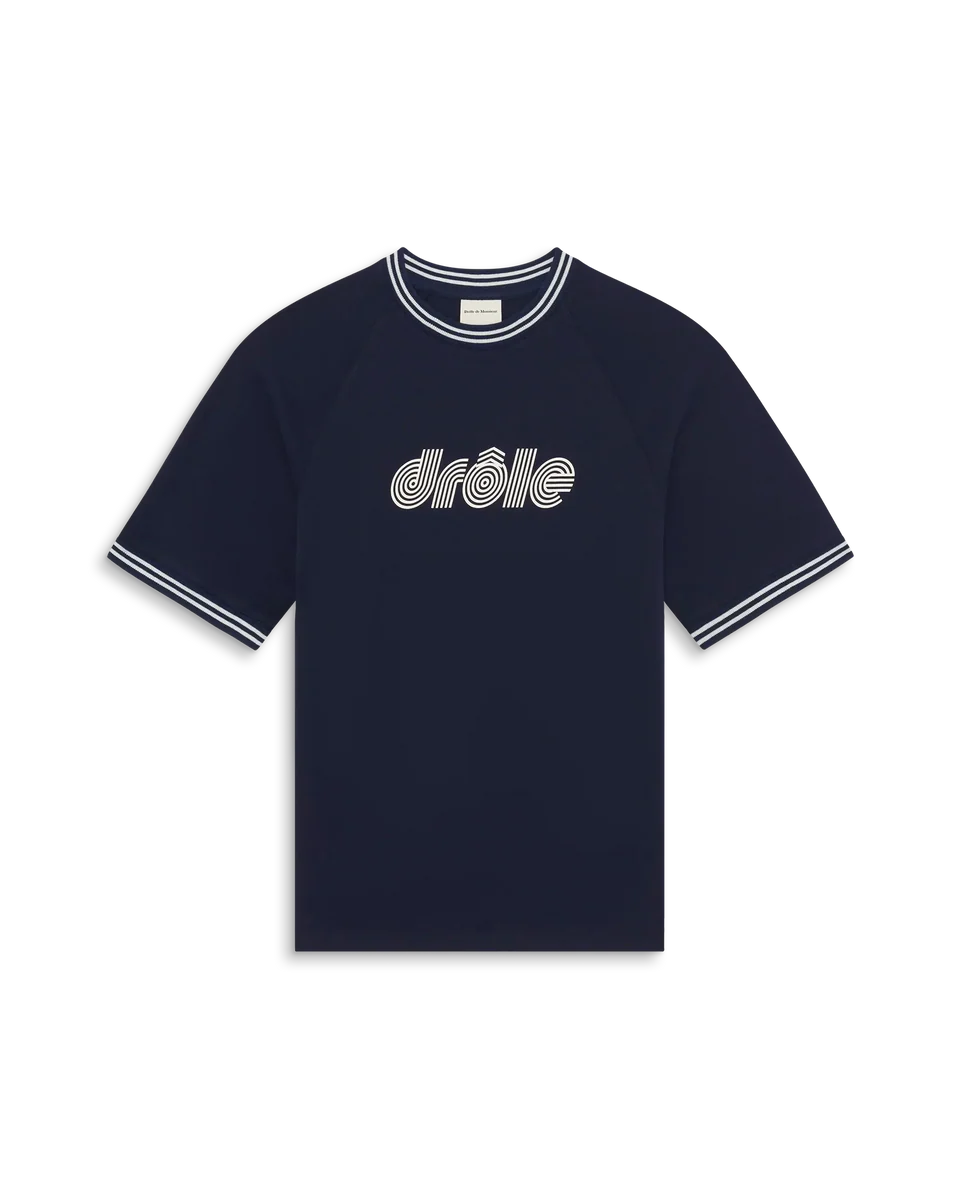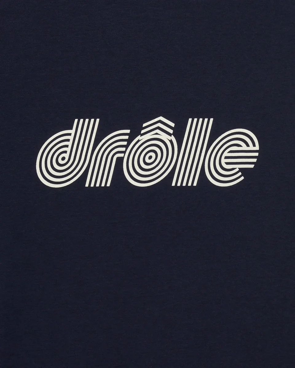 Ce t-shirt bleu marine 100% coton interlock à encolure en bord-côte est imprimé du motif Drôle Sport à l’avant.