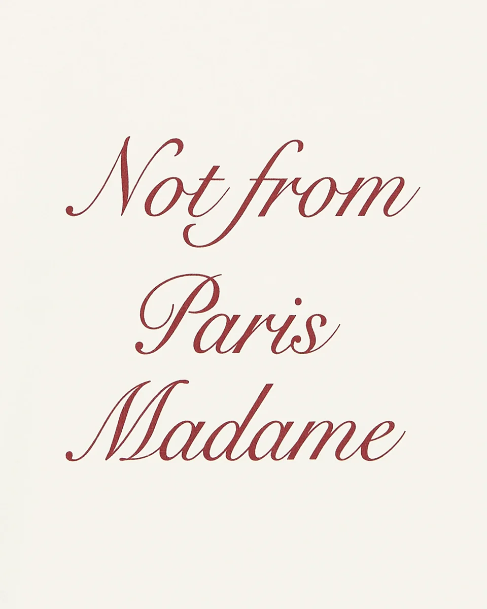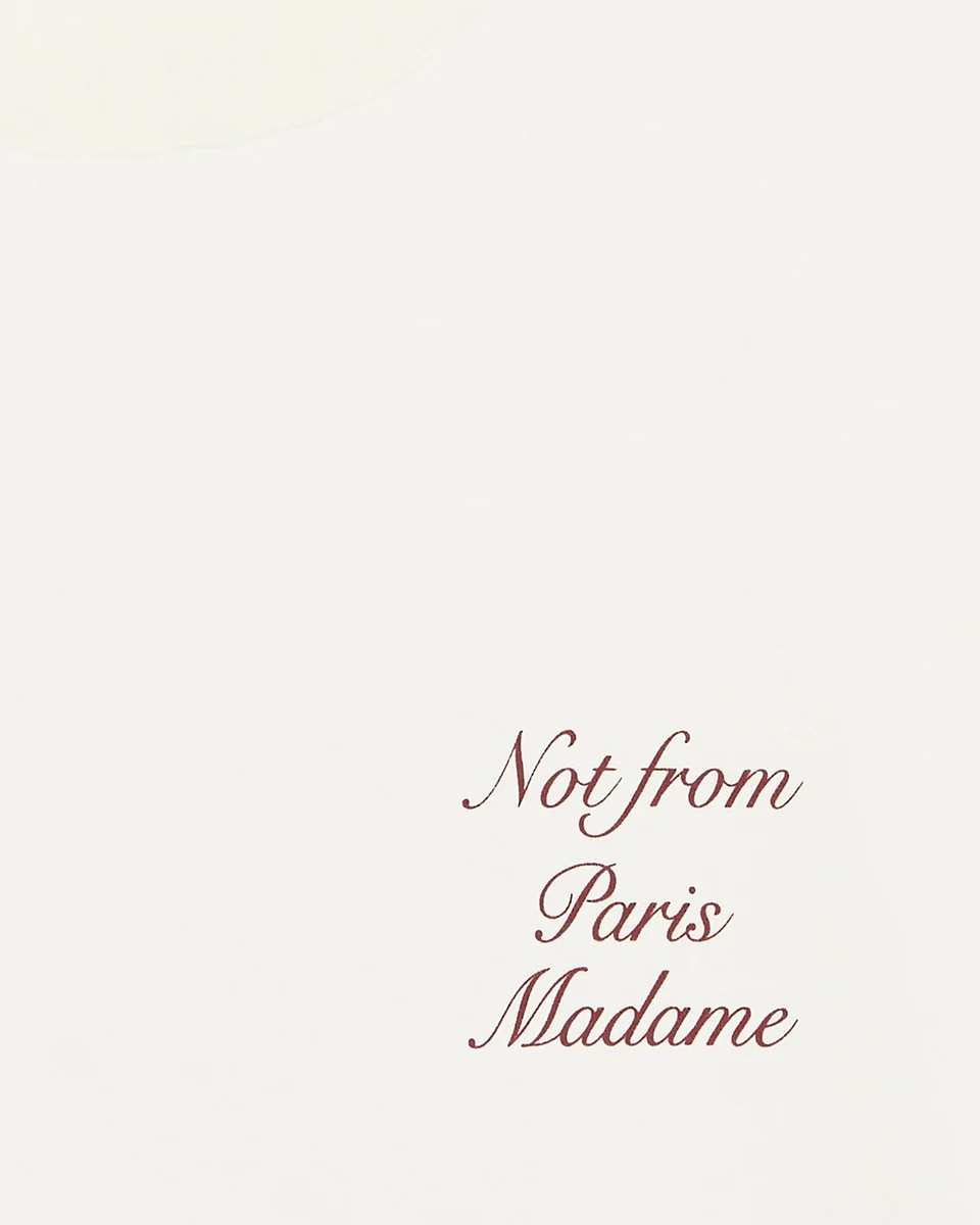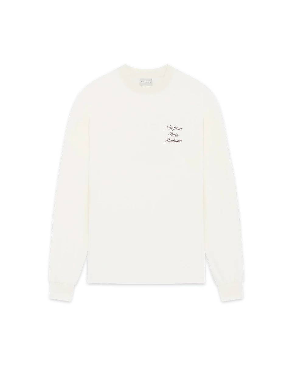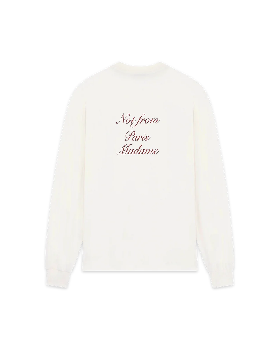 Ce t-shirt blanc cassé 100% coton interlock, à manches longues et à encolure côtelée est imprimé du slogan calligraphié « Not from Paris Madame » à l’avant et à l’arrière.