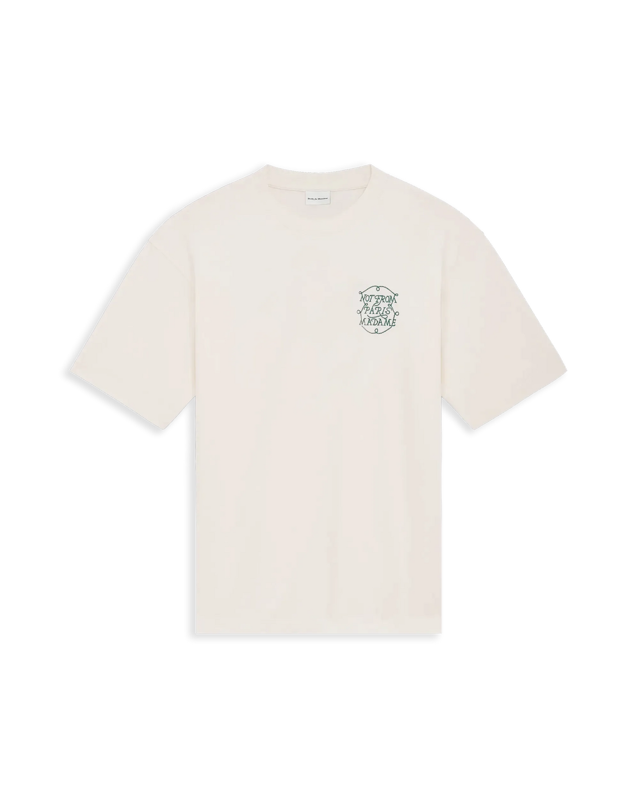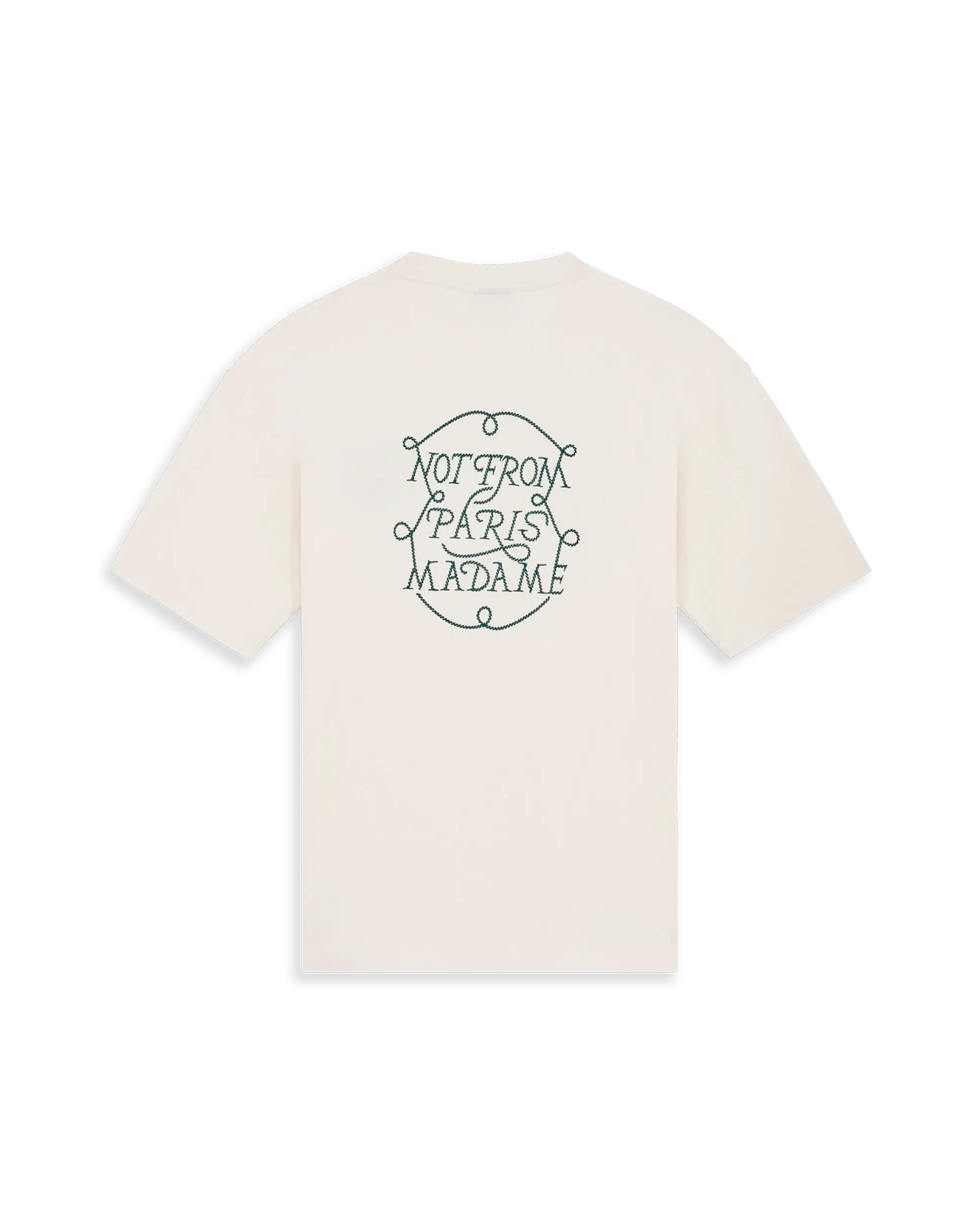 Ce t-shirt en jersey 100 % coton blanc cassé avec un décolleté côtelé est brodé du motif Slogan Tresses sur la poitrine et le dos.
