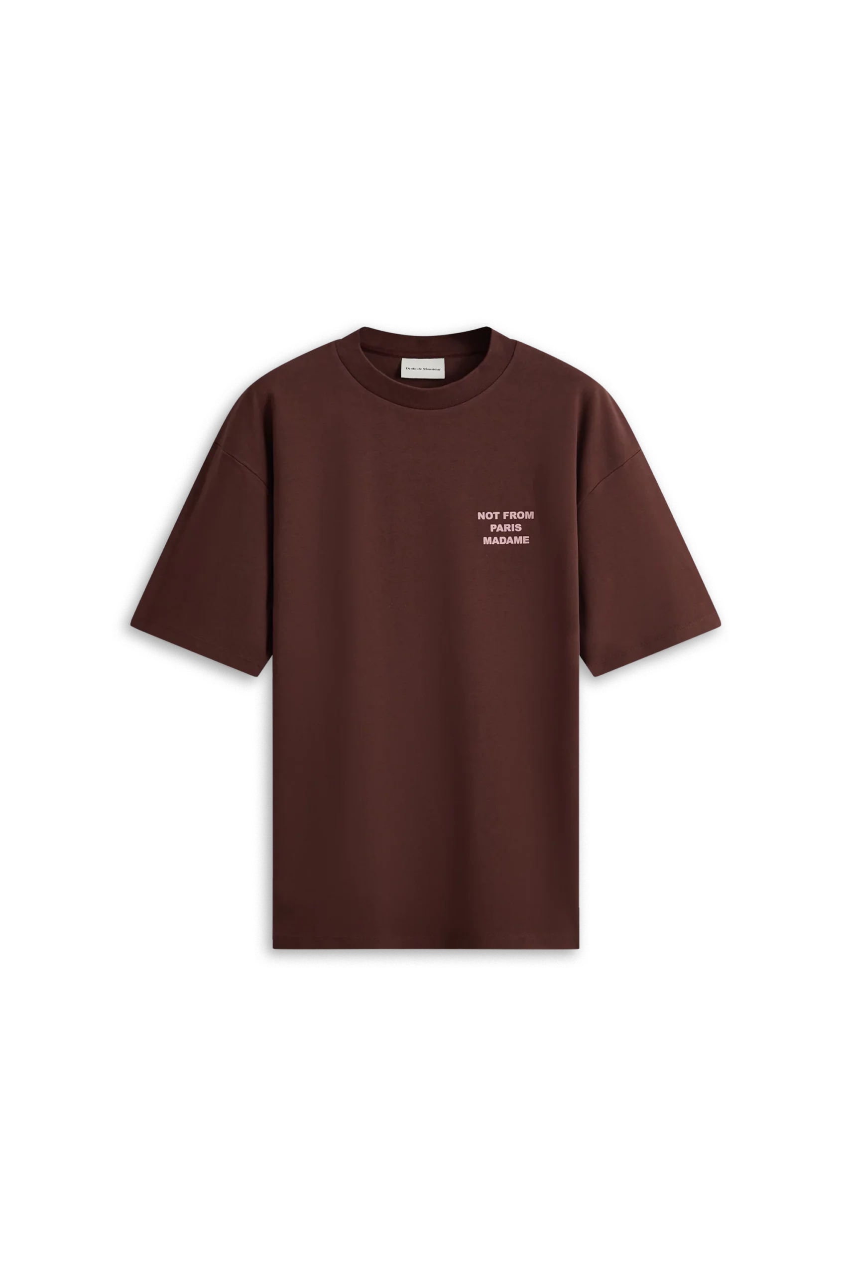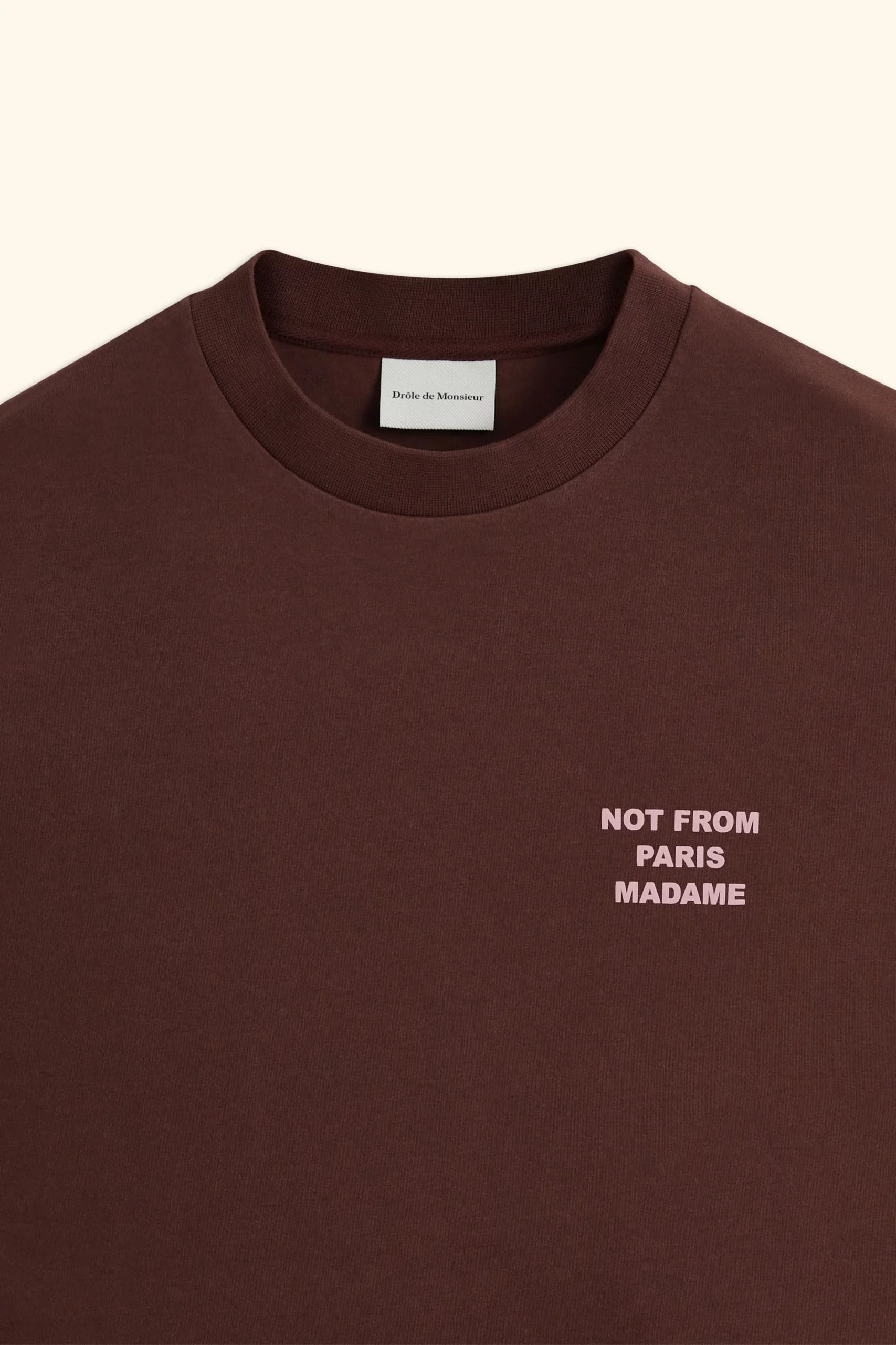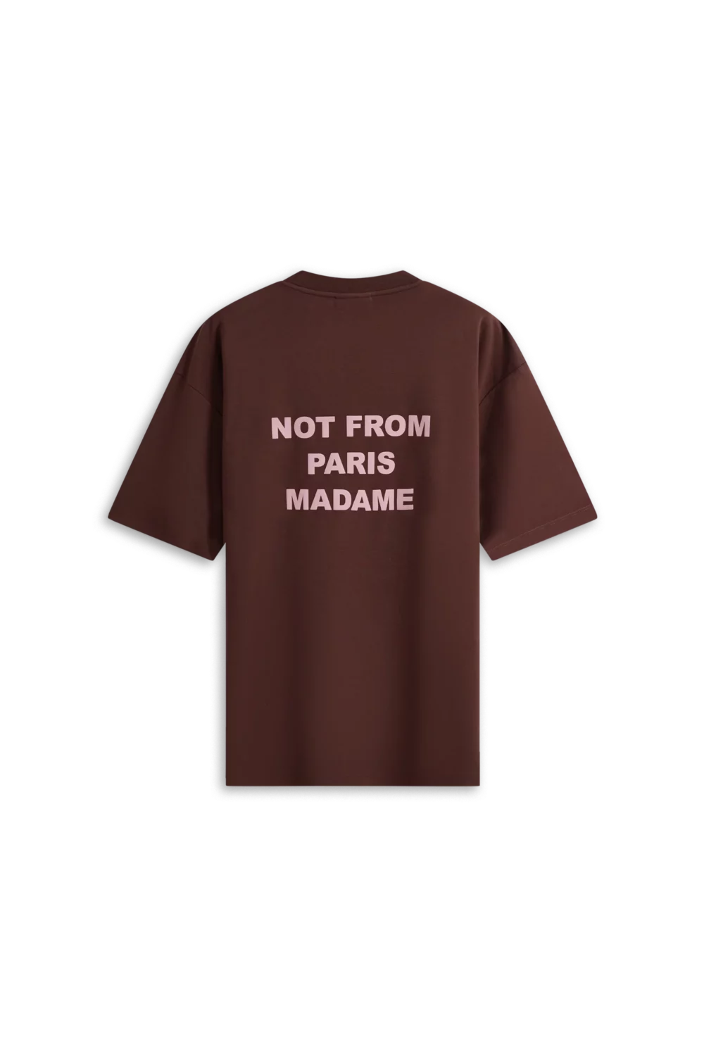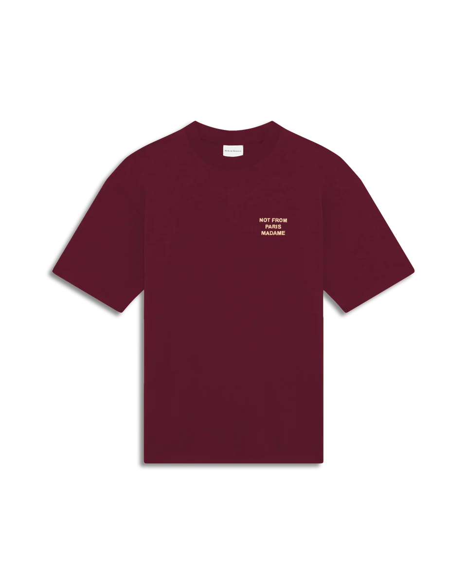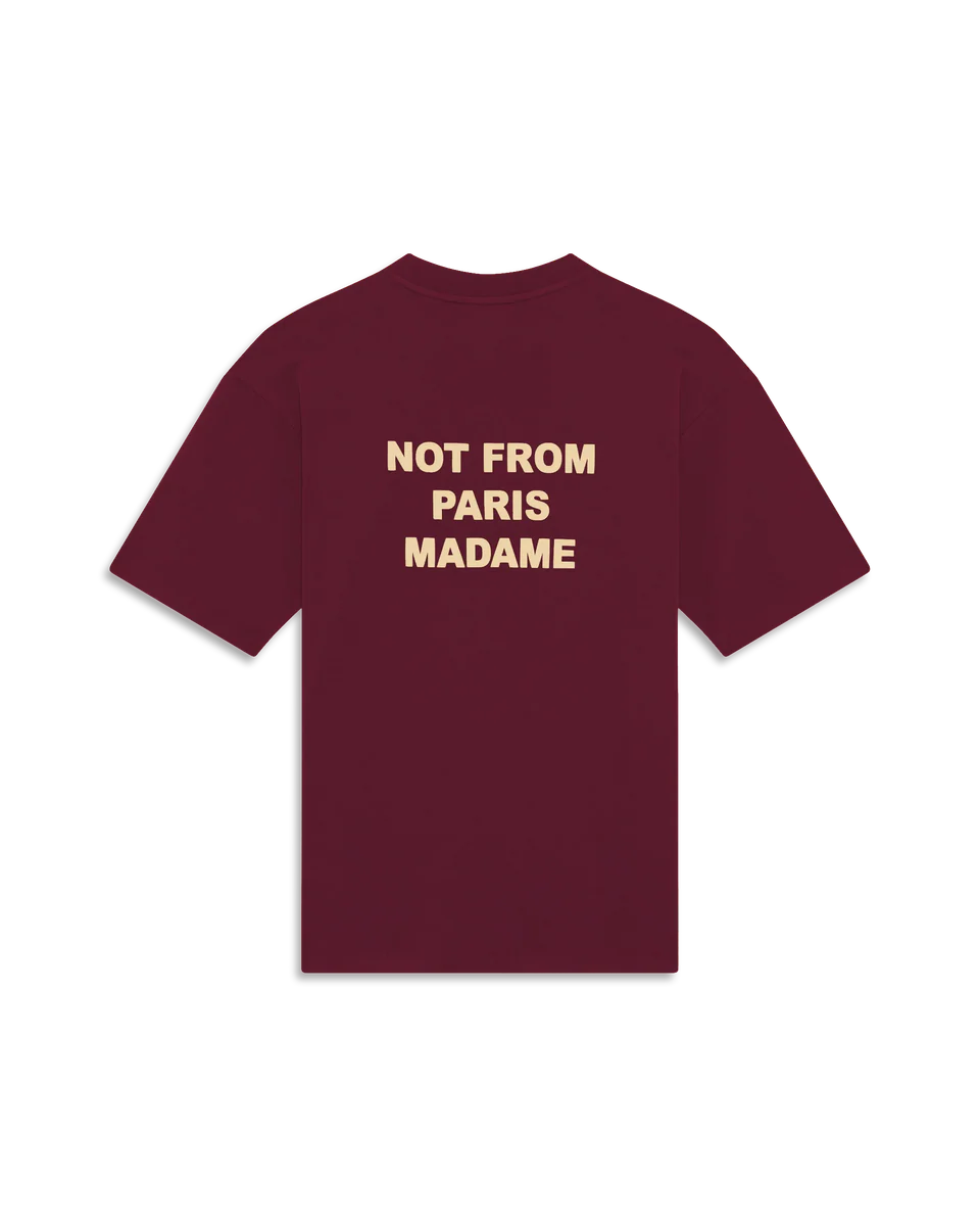 Le T-Shirt Slogan.Fabriqué en tissu interlock 100 % coton, ce t-shirt couleur bordeaux présente une encolure côtelée et le slogan « Not from Paris Madame » imprimé devant et derrière.