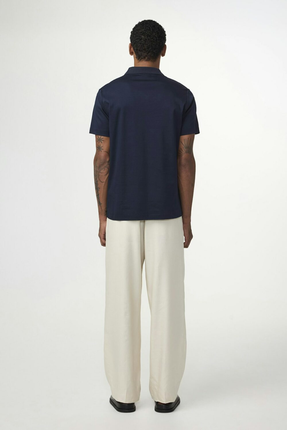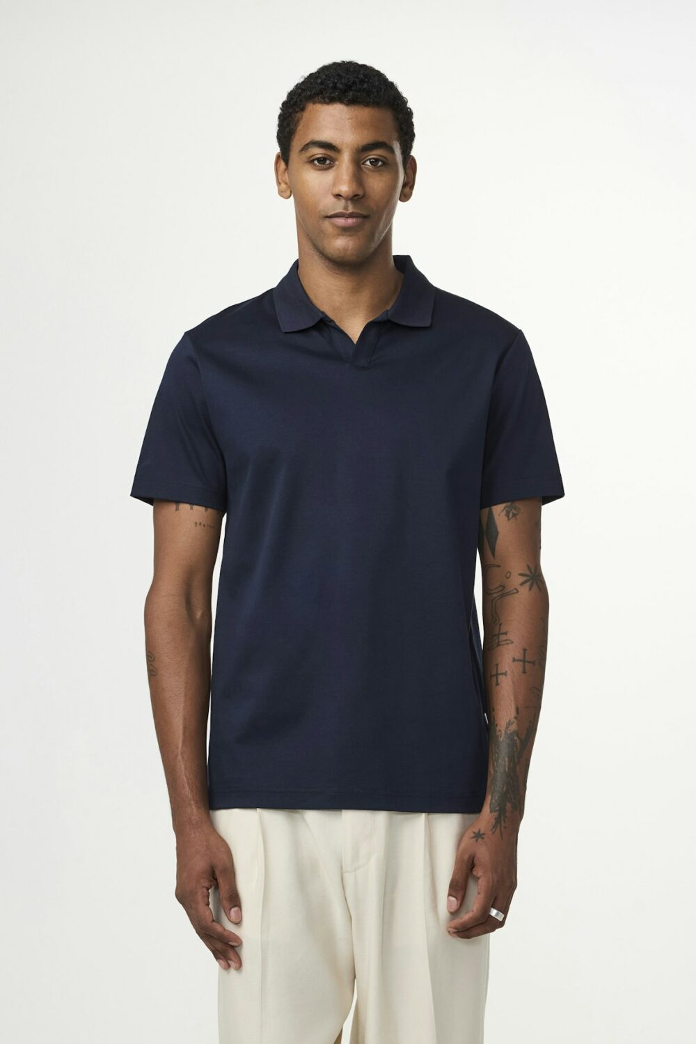 Polo à col ouvert confectionné en jersey de coton biologique, avec des coutures doubles sur l’ensemble du vêtement.