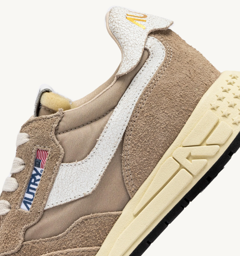 La basket Reelwind pour homme explore le dynamisme urbain avec une construction à empiècements qui associe nylon et daim beige ton sur ton à des inserts en cuir craquelé blanc.
