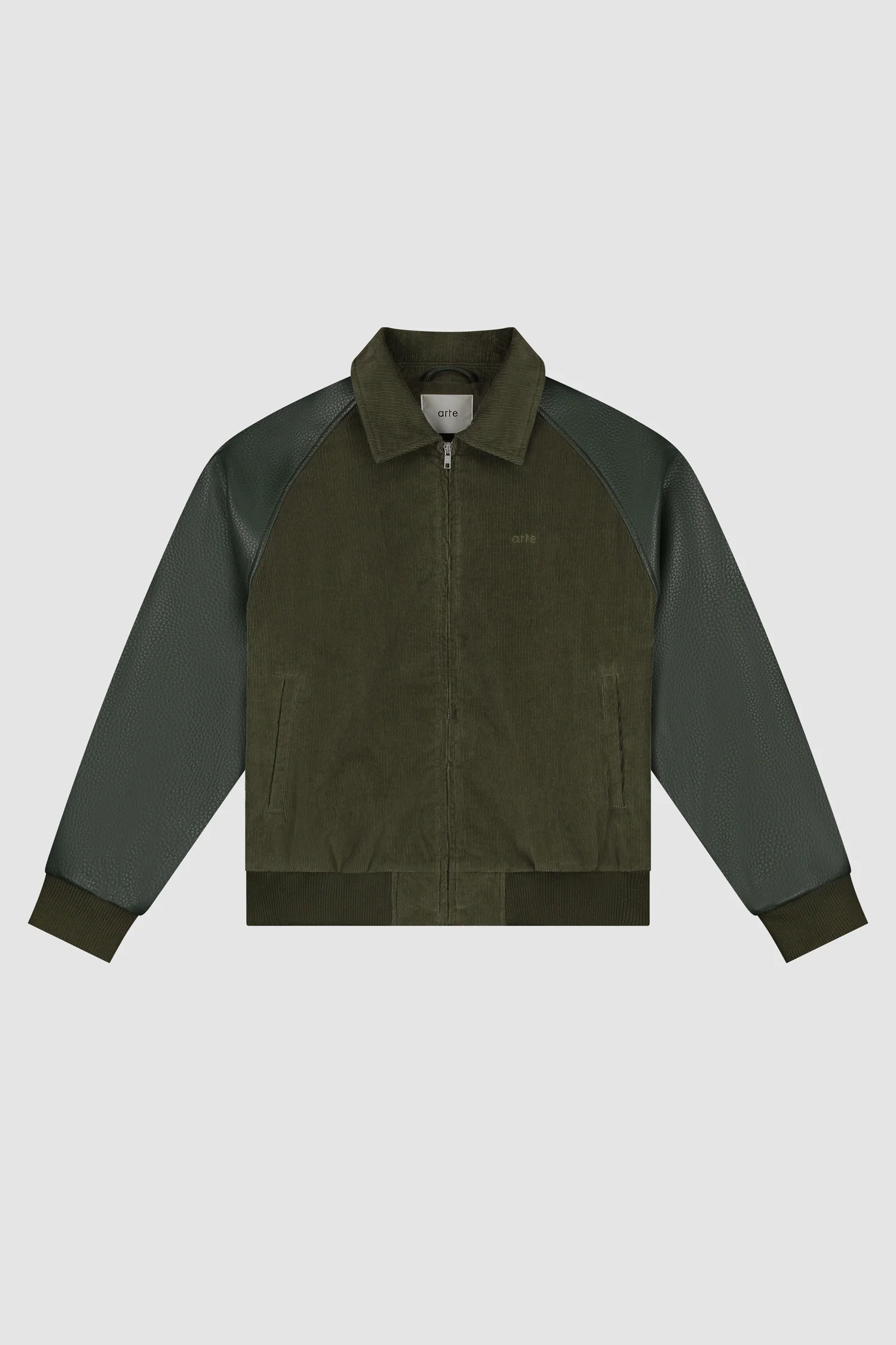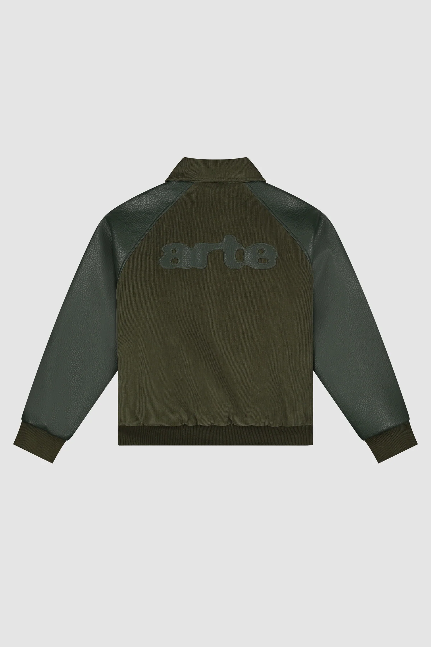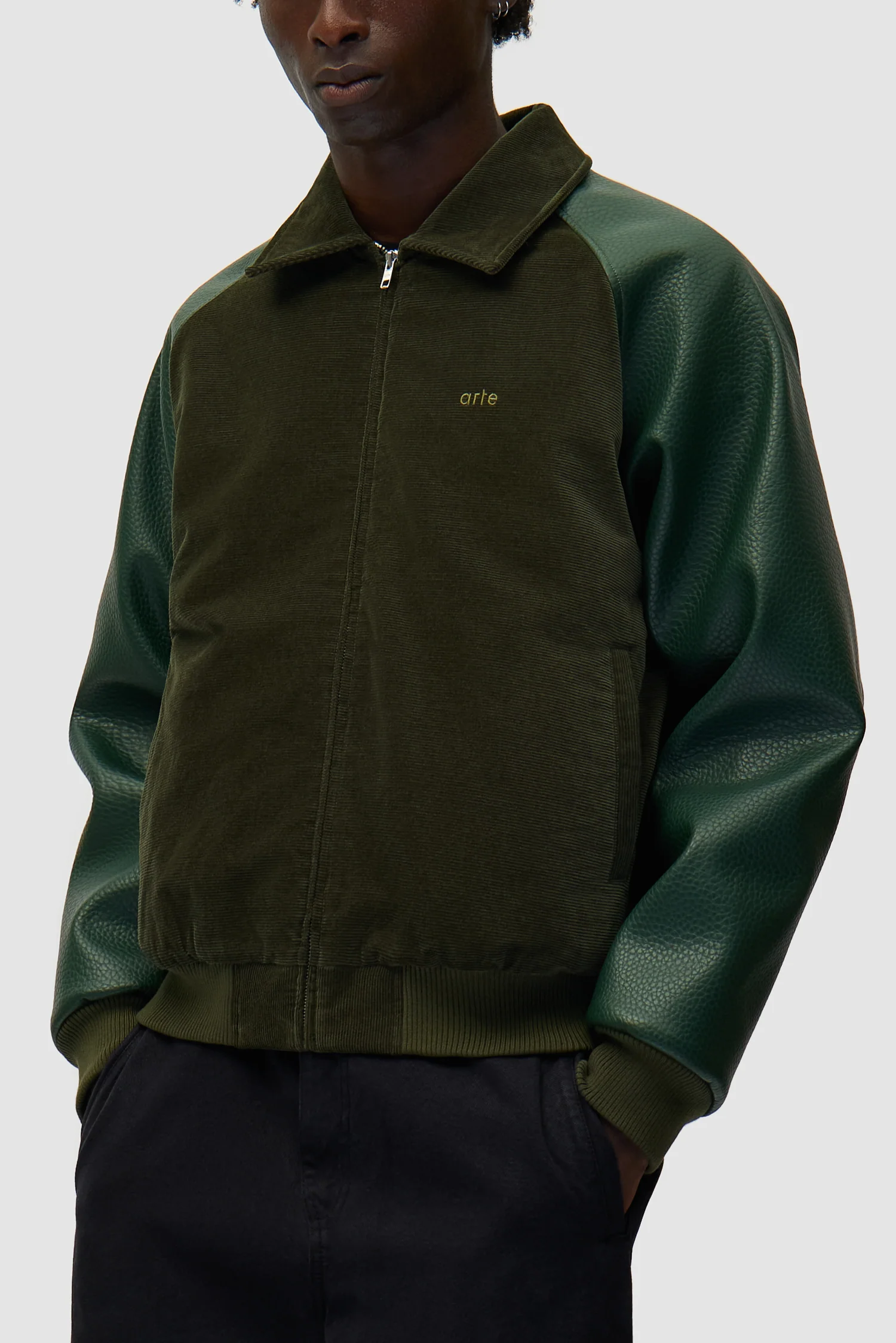Conçue dans une combinaison de faux cuir et de velours côtelé, cette veste de couleur vert foncé est une pièce de choix pour toutes les saisons. Elle offre un style sans effort, rehaussé d’un écusson en cuir vert saisonnier d’Arte au dos. La veste a une fermeture à glissière, deux poches latérales, des bordures élastiques et est finie avec un logo brodé ton sur ton sur la gauche de la poitrine.