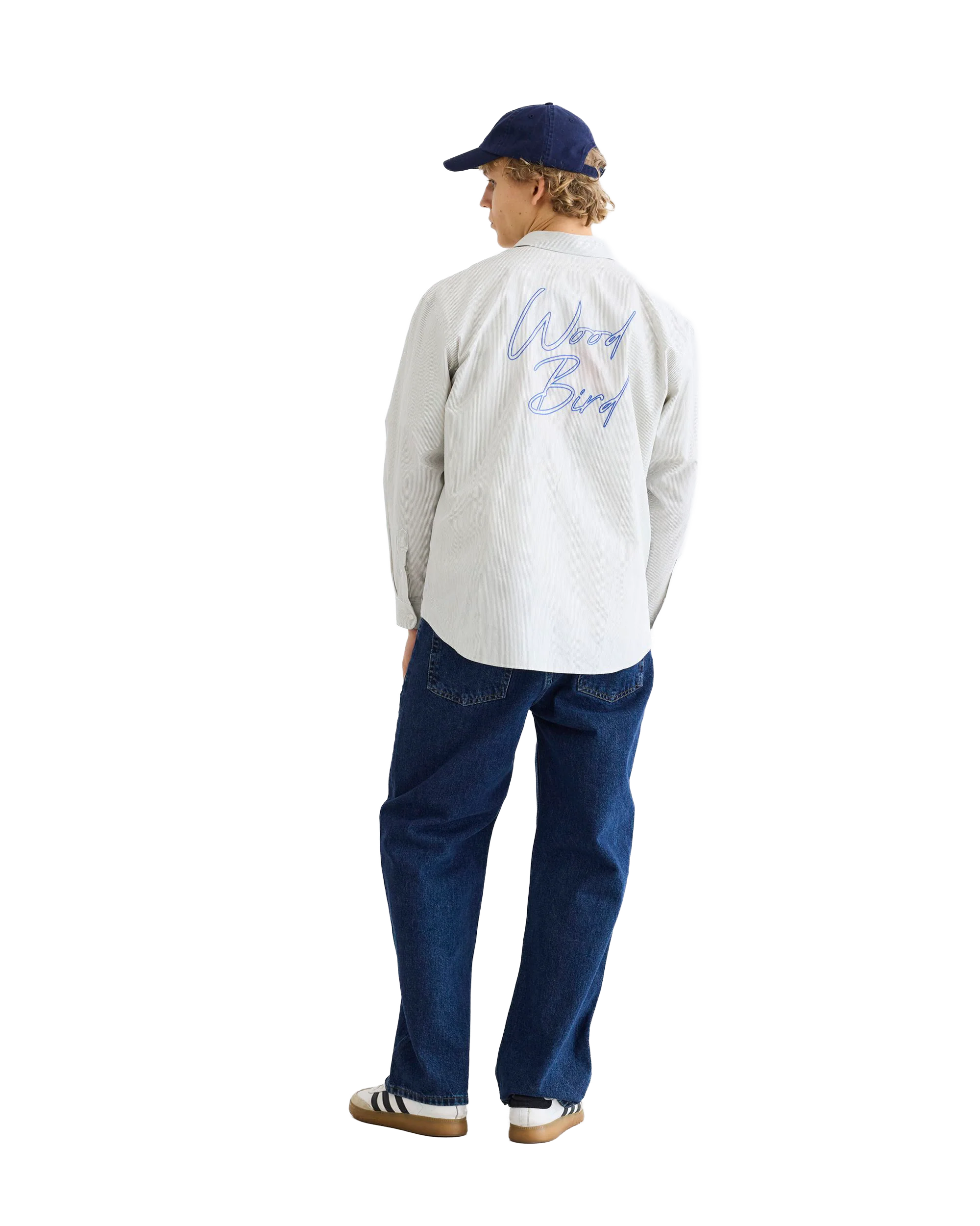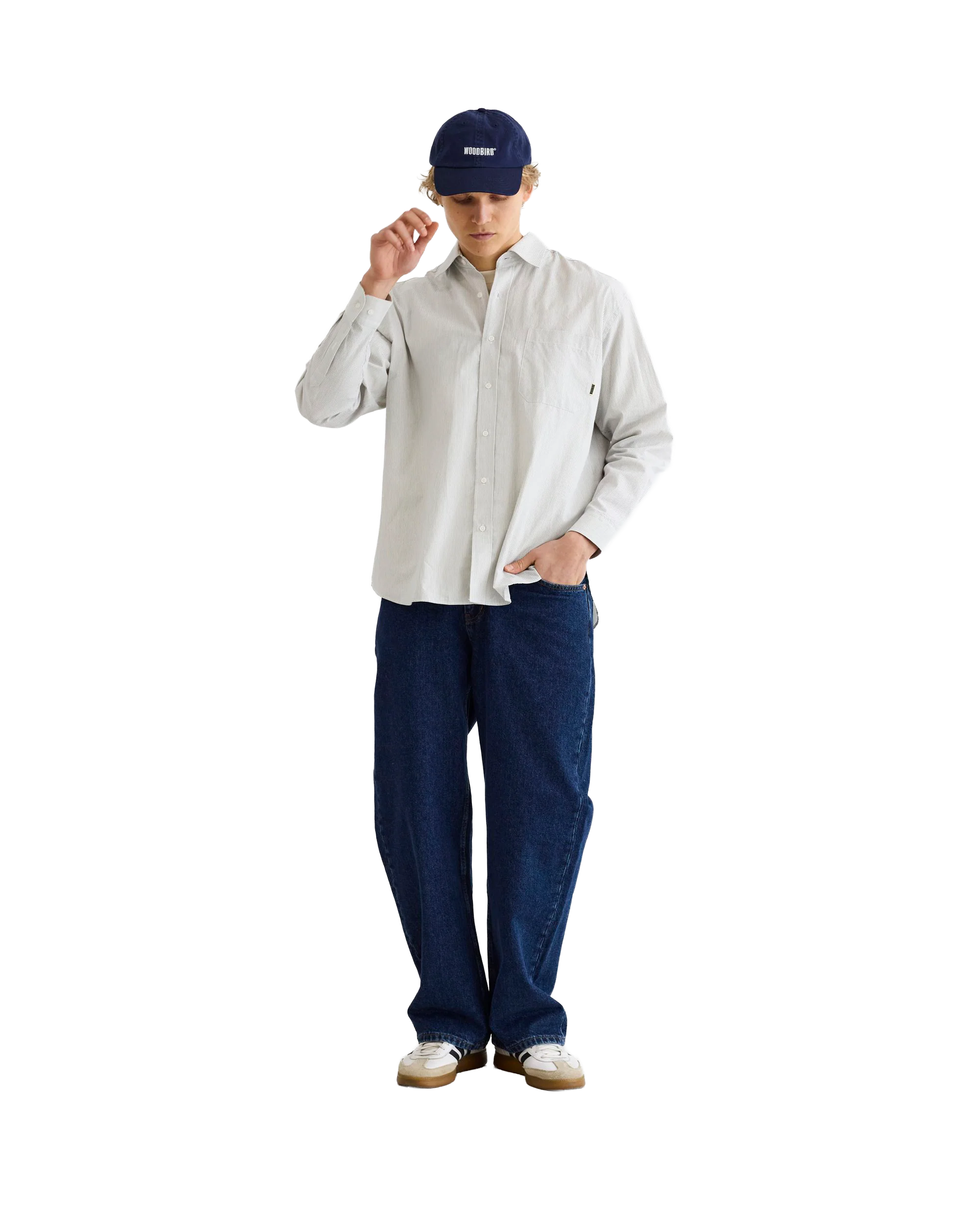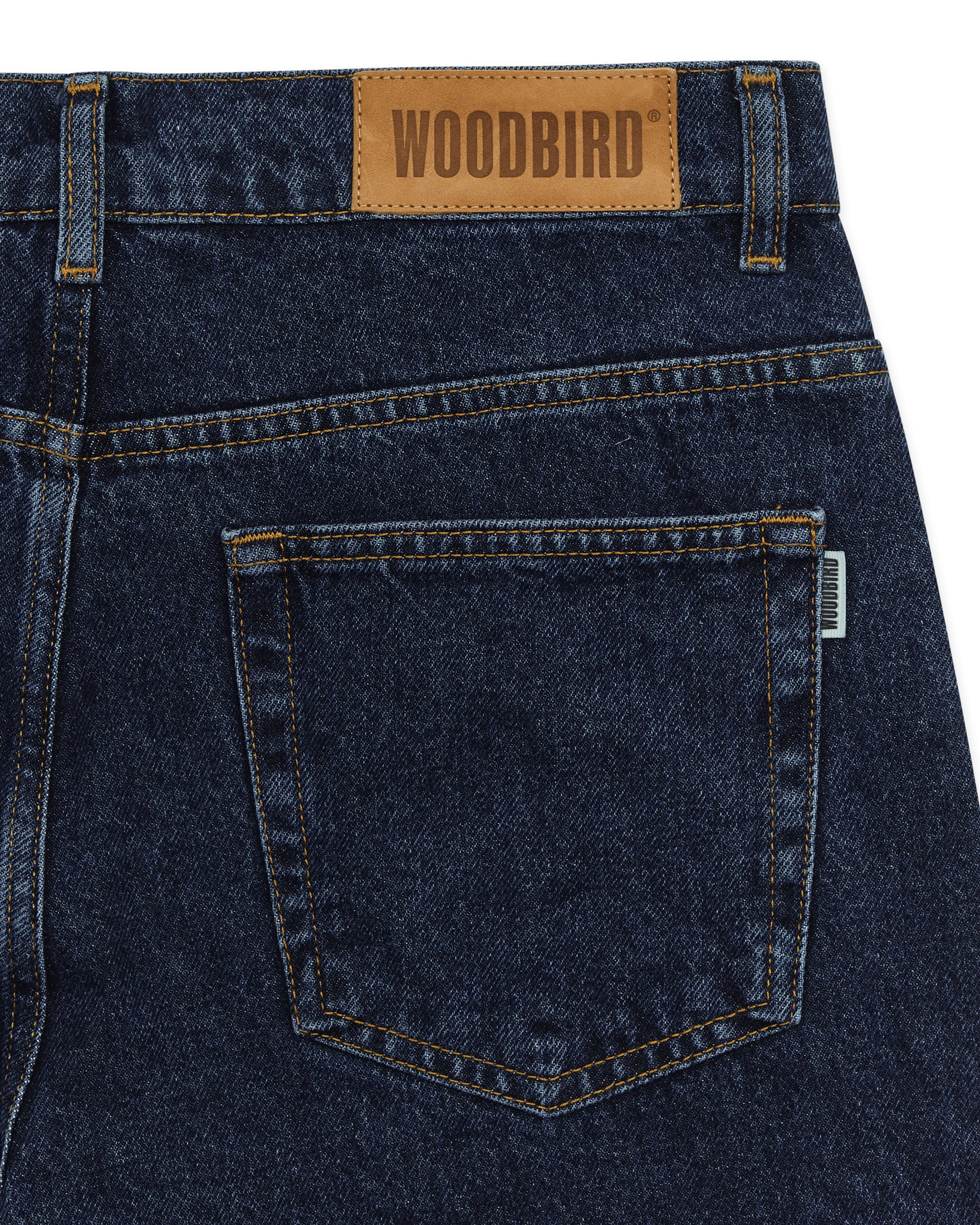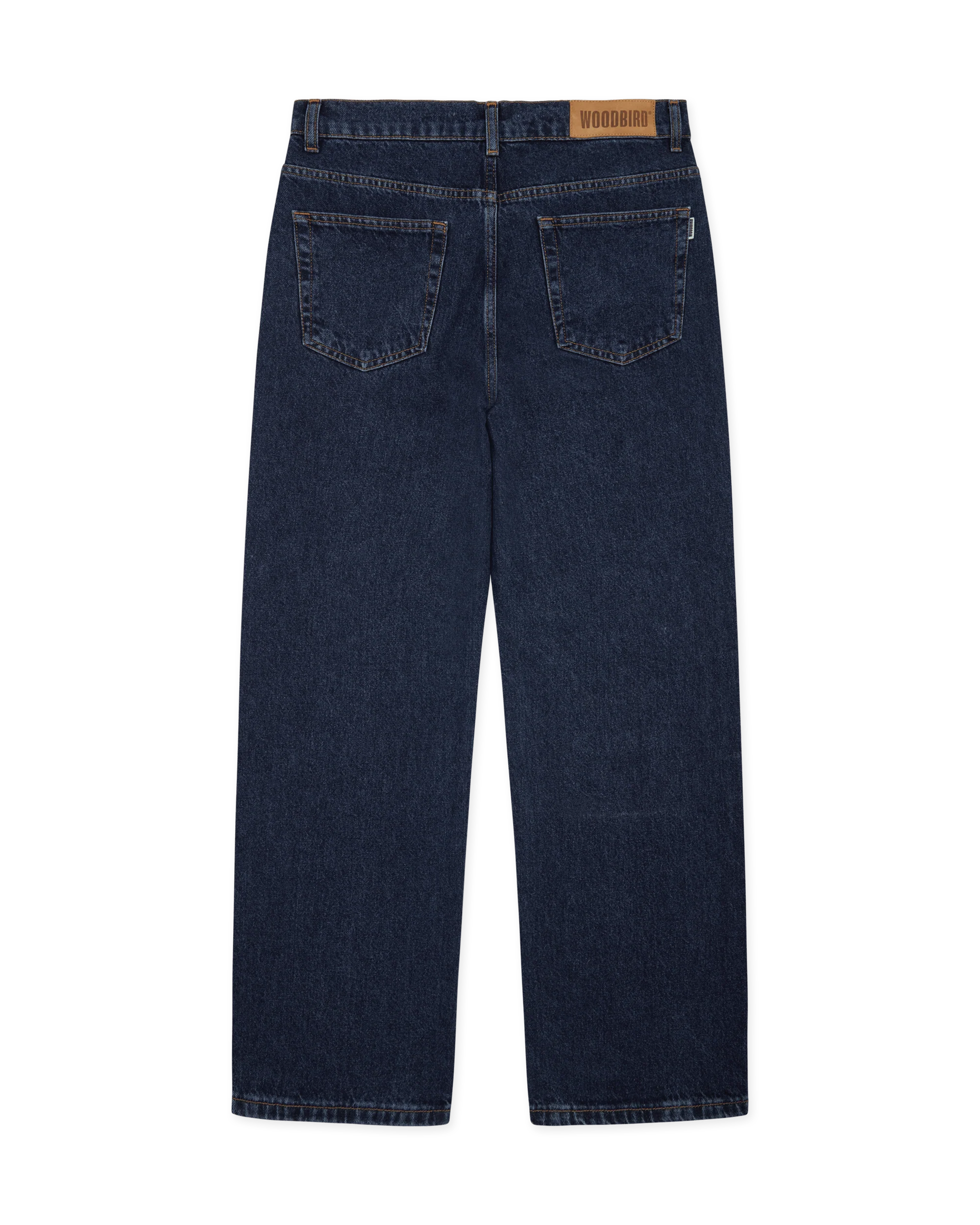 Jean en denim coupe ample, cinq poches et écusson de marque à l’arrière.